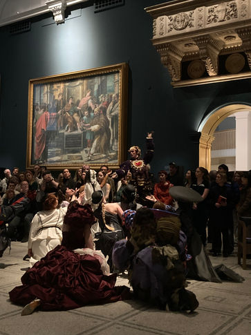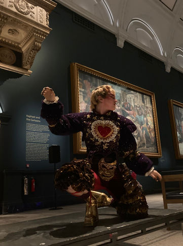 In a collaborative performance between the costume and acting students of Wimbledon College of Arts and the V&A museum, I created a costume based on a mask from Derek Jarmans 1986 film 'Caravaggio'. Inspired by 16th century renaissance art and 80s homoerotica, I created a bedazzled, velvet depiction of Caravaggio as the roman god Bacchus.